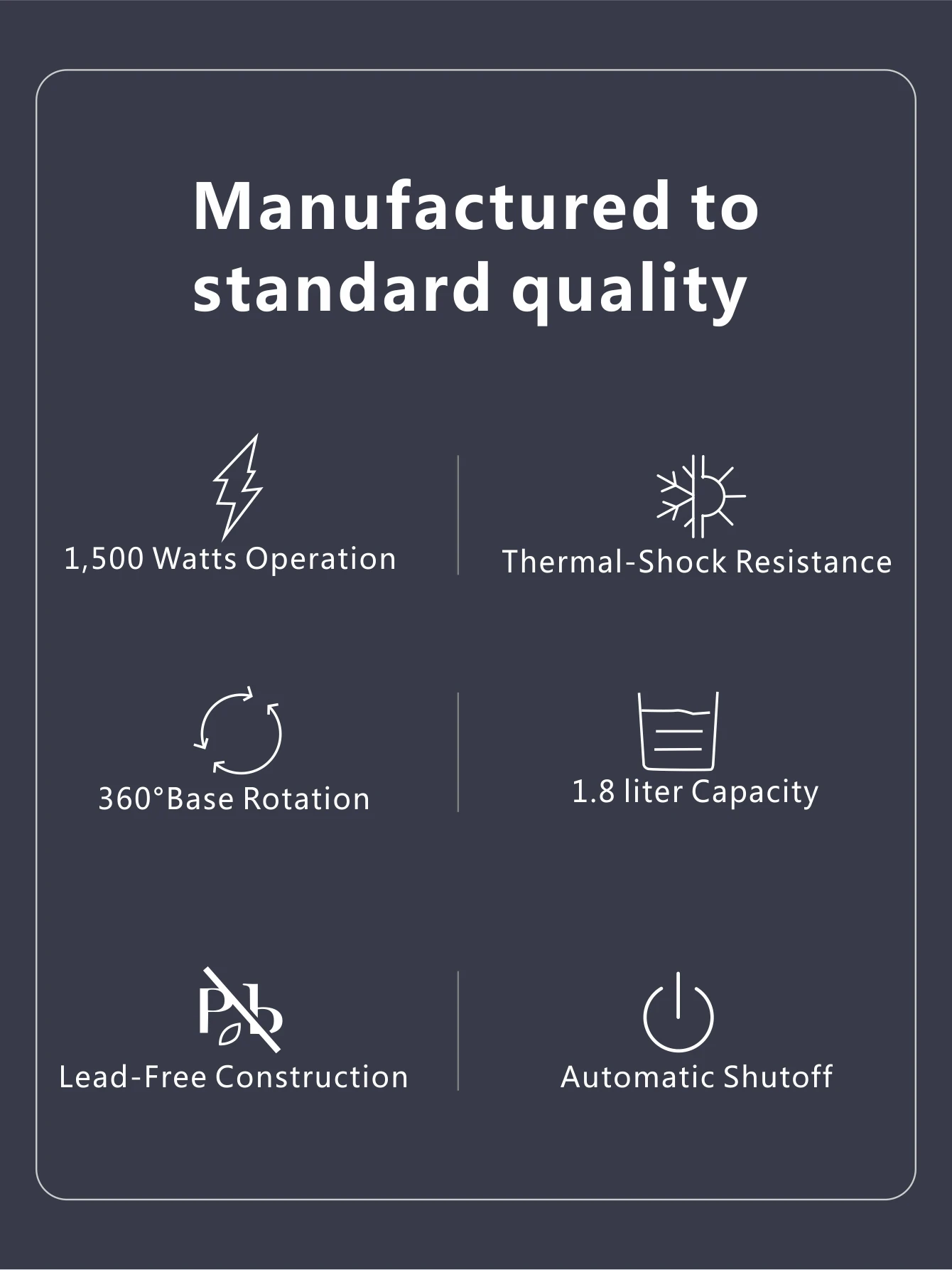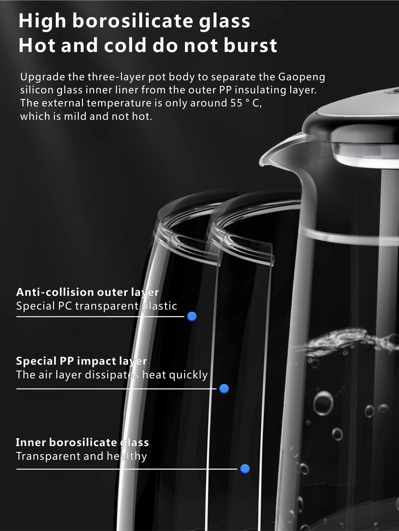 The electric kettle is combined of food-grade borosilicate glass and stainless steel makes it looks fascinating and healthier. The borosilicate glass has a very low coefficient of thermal expansion, making it resistant to thermal shock. BPA-Free, 100% stainless steel inner lid and bottom, take care of your safety and health.